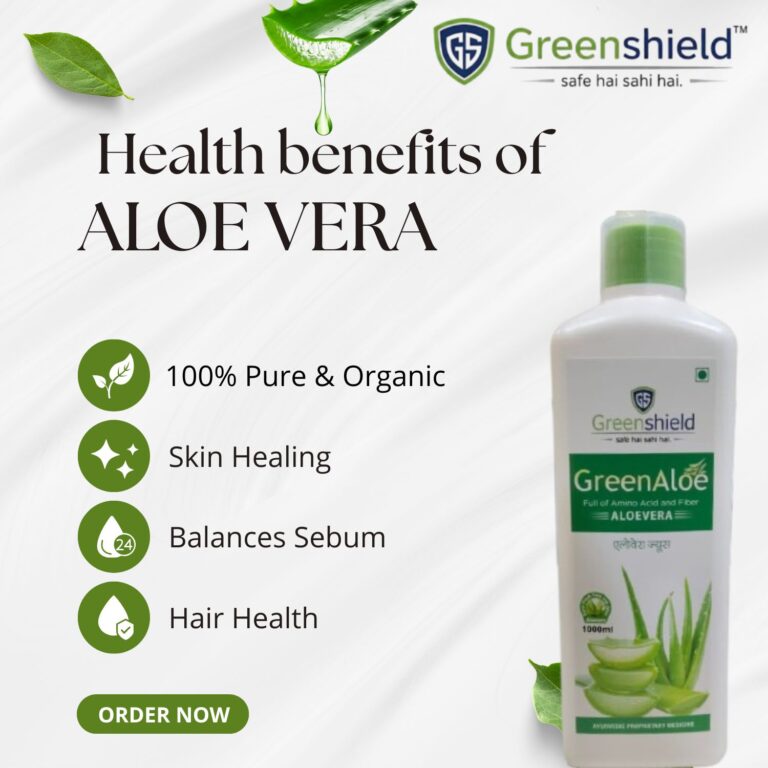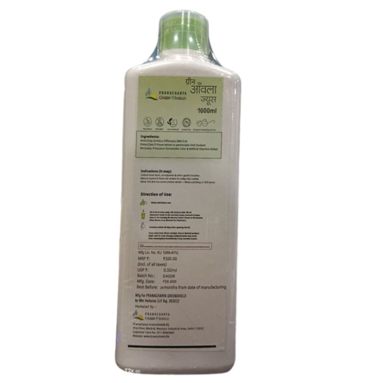 Buy Pranacharya Greenshield Herbal juices detox your body and also help your skin glow. The natural ingredients in herbal juices provide you with important nutrients and promote a healthy body. Moreover, they are loaded with a bunch of vitamins like A, B, C, and E. Some herbs like fennel, ginger, and peppermint, can help to improve digestion by reducing bloating, gas, and indigestion. It also improves the body’s natural defences against infections and disease. We manufacture and supply all kinds of juices in the online market. Some best-sellers are Amla Shield Juice, Green Aloe Vera Juice, Noni Juice – 1 L